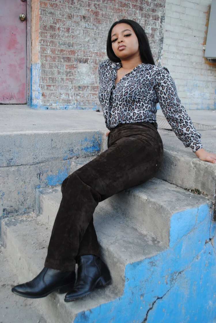 (Leah is featured in a ‘90s silk tiger top, ‘90s corduroy mini skirt & golden metal belt)
