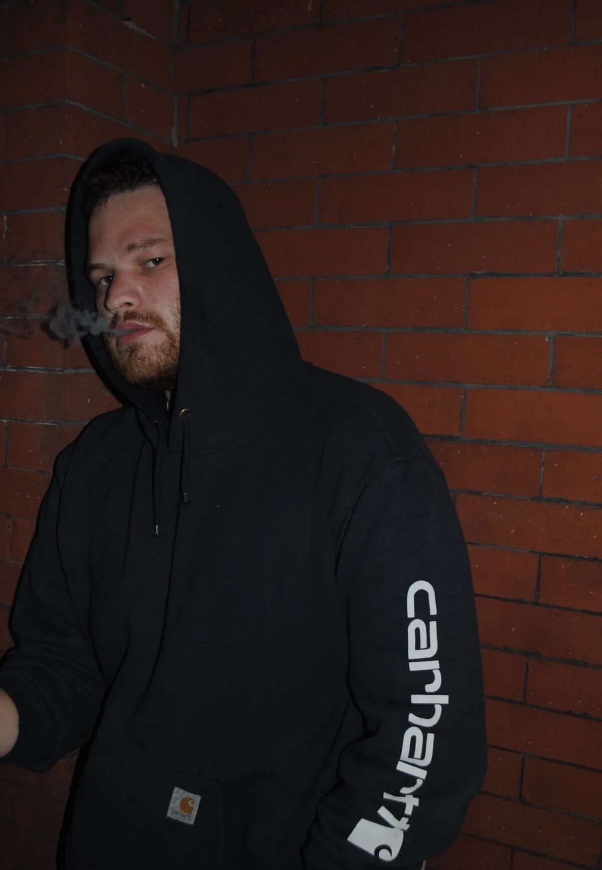 Portrait of Dustin in vintage Carhartt hoodie shot by Leah to wrap up the shoot